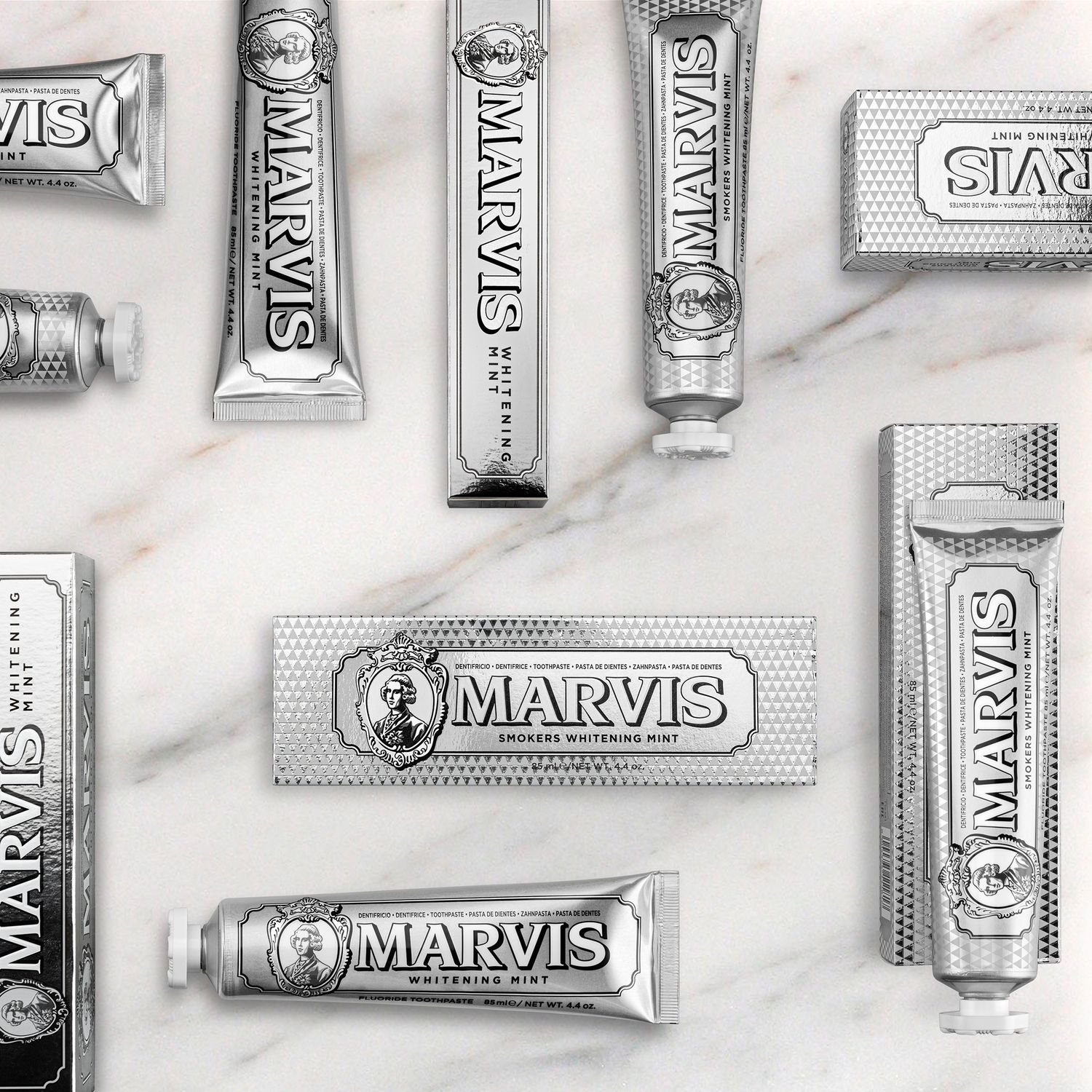 Цагаан, гялалзсан инээмсэглэлийн хувьд Марвис цайруулах үйлчилгээтэй гааны амттай оо нь тамхи татахаас үүссэн шарлалт, өнгөр, тамхины амт үнэр, хоол хүнс, кофе, цай, ундаанаас үүдэлтэй толбыг арилгаж, шүдний байгалийн өнгийг сэргээдэг. "Сэрүүн" гааны амт нь хүчтэй, мартагдашгүй шинэлэг байдлыг үлдээдэг.